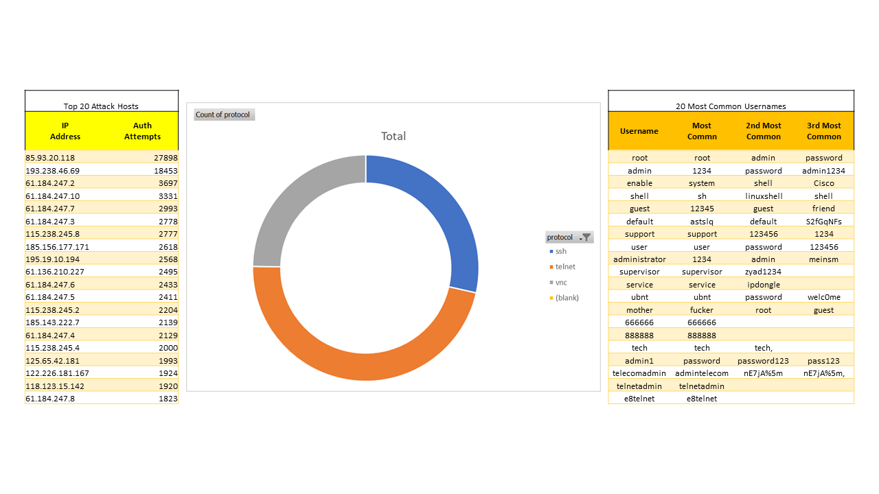 Also, you can download the full list of username and passwords or the list of attack source IPs to see every password I saw or everyone who tried to attack.