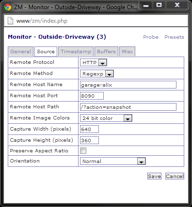 Next, navigate to the source tab, this is where we actually tell zoneminder how to interface with the camera. Depending on the source you have configured you may find different fields here. Here is how I have this configured for remote.